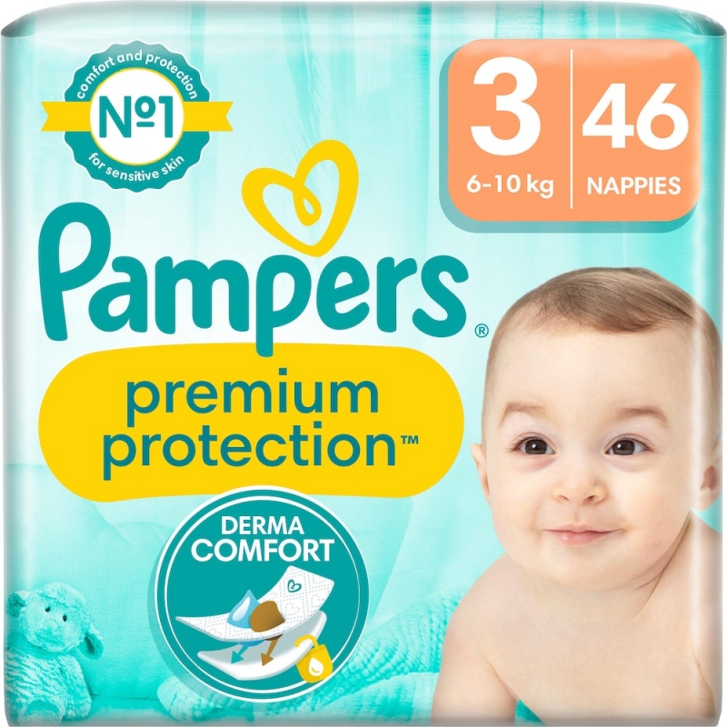 „Pampers Premium Protection“ sauskelnės su tampresnėmis bei minkštesnėmis juosmens gumelėmis, su papildomu greičiau drėgmę sugeriančiu sluoksniu, minkštos kaip medvilnė, kvėpuojančios.