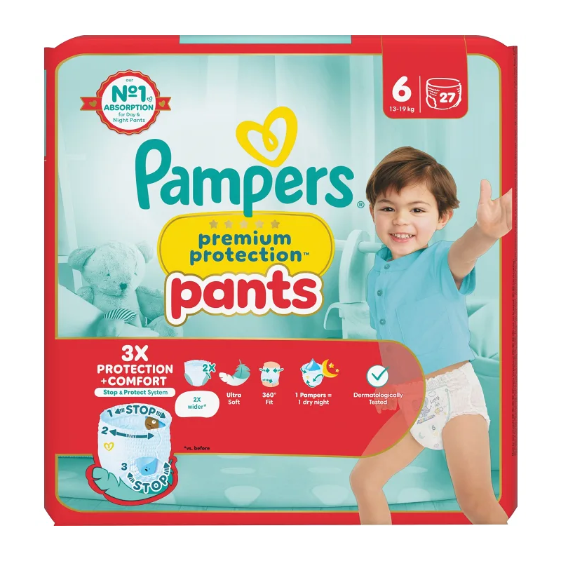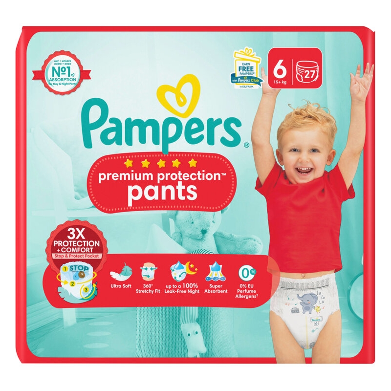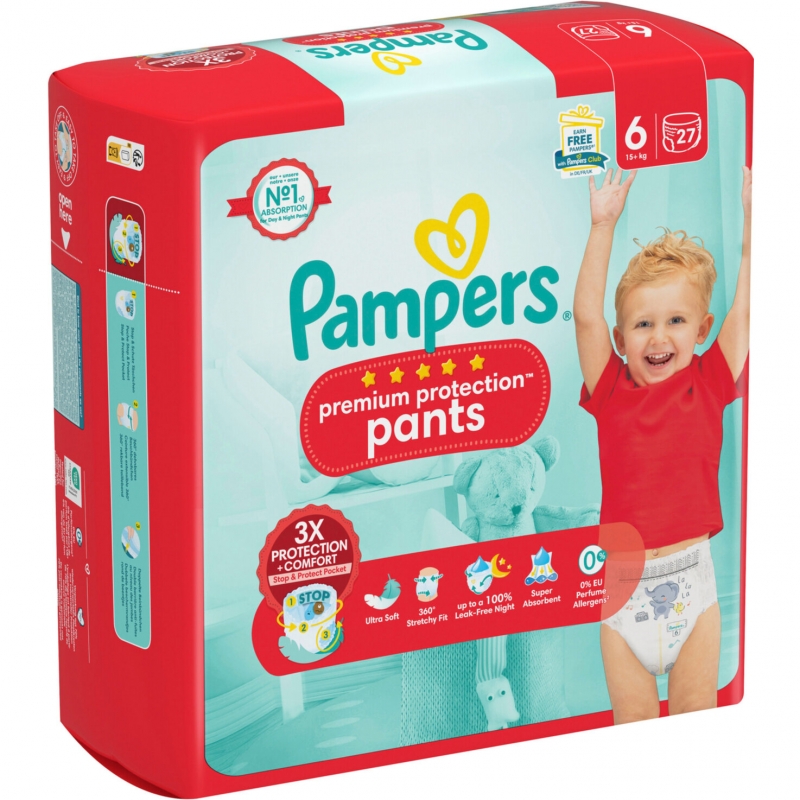 „Pampers Pants Premium Protection“ sauskelnės - kelnaitės su tampresnėmis bei minkštesnėmis juosmens gumelėmis, su papildomu greičiau drėgmę sugeriančiu sluoksniu, minkštos kaip medvilnė, kvėpuojančios, patogios greitai uždėti bei nuimti.